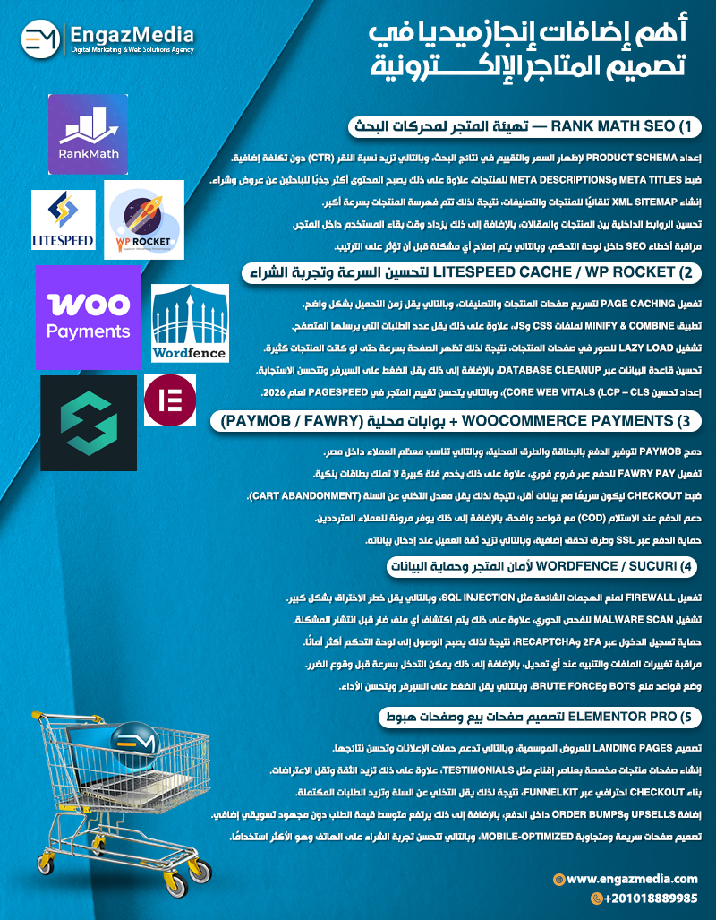 لكي ينجح المتجر الإلكتروني في 2026، لا يكفي أن يكون جميلًا من الخارج، بل يجب أن يعتمد على نظام إضافات (Plugins) ذكي يضمن الأداء والأمان وتجربة المستخدم والتسويق. لذلك تعتمد إنجاز ميديا (Engaz Media) على مجموعة مدروسة من الإضافات الاحترافية عند تصميم موقع WordPress وWooCommerce.