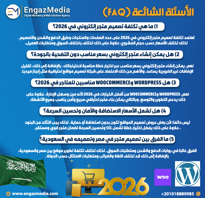 في النهاية، فإن تكلفة تصميم متجر إلكتروني في 2026 لا تُقاس بالسعر فقط، بل بالقيمة التي يقدمها المتجر من سرعة وأمان وتجربة مستخدم وتهيئة SEO تؤدي إلى مبيعات فعلية. لذلك فإن اختيار شركة تصميم مواقع قادرة على تقديم متجر قوي يعتمد على WordPress وWooCommerce هو القرار الأذكى لأي مشروع يسعى للنمو. علاوة على ذلك، توفر إنجاز ميديا (Engaz Media) خططًا مرنة تناسب المشاريع الصغيرة والمؤسسات، مع استضافة قوية وإضافات احترافية وتحسين سرعة يدعم نجاح المتجر. الأهم من ذلك أن إنجاز ميديا تُعد أفضل شركة تصميم مواقع في مصر لأنها توازن بين الجودة والتكلفة وتضمن لك متجرًا قابلًا للتوسع يحقق التوفير وراحة الإدارة على المدى الطويل. بالتالي، إذا كنت تبحث عن متجر احترافي يعكس علامتك ويزيد أرباحك، فاختيارك لإنجاز ميديا هو البداية الصحيحة لنجاح مستدام.