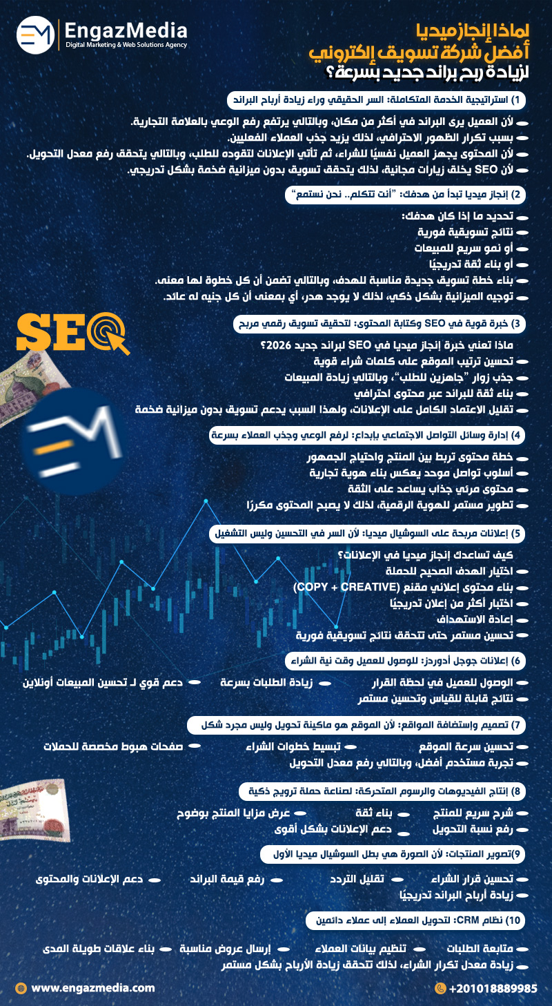 ولهذا السبب عندما تختار إنجاز ميديا فأنت لا تختار خدمة فقط، بل تختار شريكًا في زيادة ربح براند جديد بسرعة بالتسويق الإلكتروني.