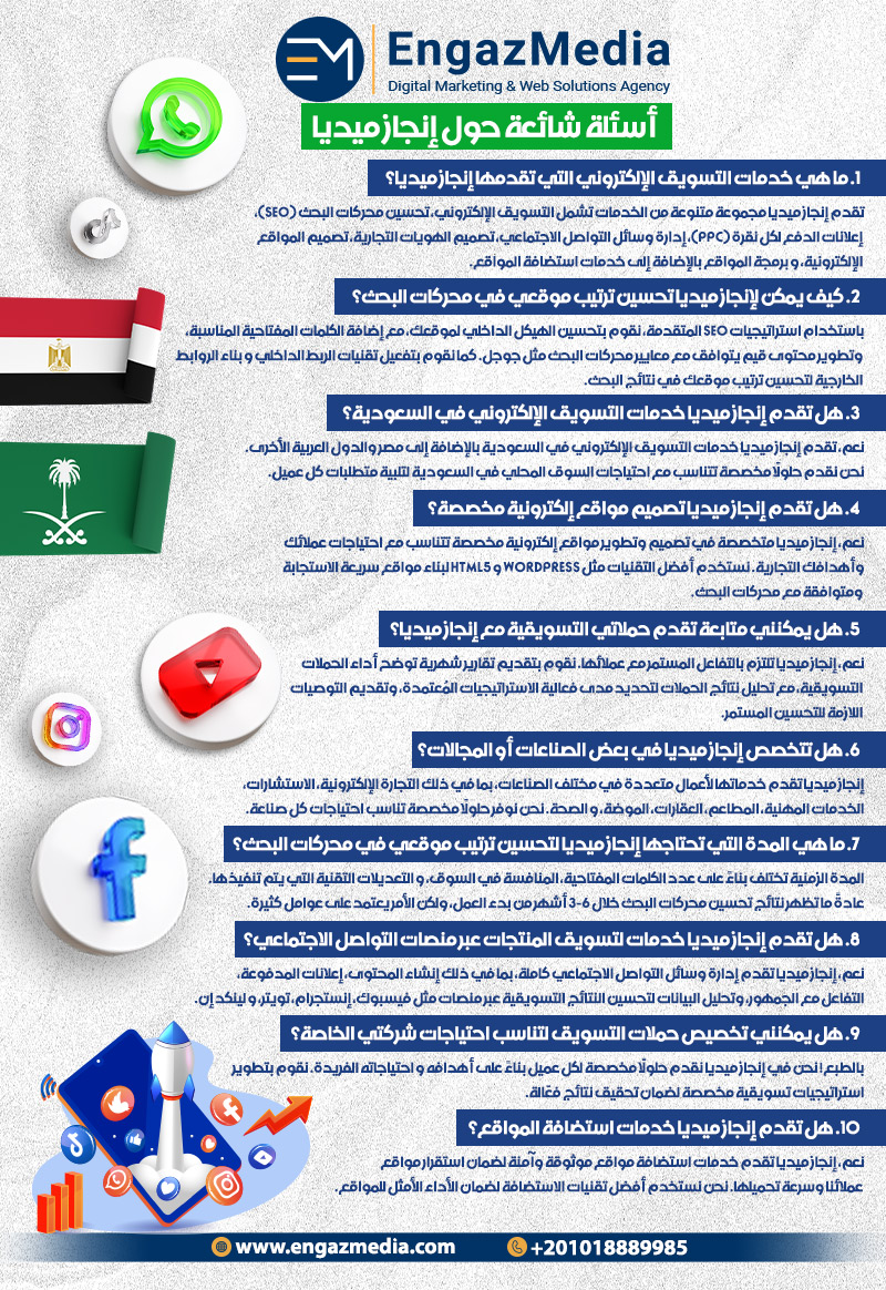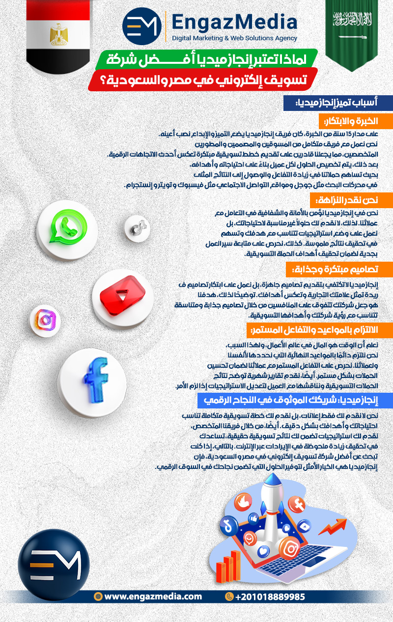 نحن لا نقدم لك فقط إعلانات، بل نقدم لك خطة تسويقية متكاملة تناسب احتياجاتك وأهدافك بشكل دقيق. أيضًا، من خلال فريقنا المتخصص، نقدم لك استراتيجيات تضمن لك نتائج تسويقية حقيقية، تساعدك في تحقيق زيادة ملحوظة في الإيرادات عبر الإنترنت. بالتالي، إذا كنت تبحث عن أفضل شركة تسويق إلكتروني في مصر و السعودية، فإن إنجاز ميديا هي الخيار الأمثل لتوفير الحلول التي تضمن نجاحك في السوق الرقمي.